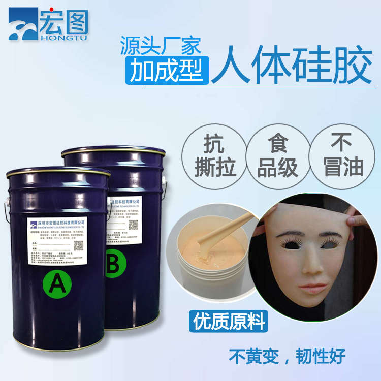 人體硅膠是一種加成型雙組份液體硅橡膠,無毒無味安全環保,硫化后會成為柔軟的彈性材料。 人體硅膠分AB雙組份,A組分硅膠,B組分固化劑,A:B一般為1:1。該產品既能室溫固化,也可以加溫固化,顏色為無色或皮膚色,其它顏色需聯系我司進行特調。